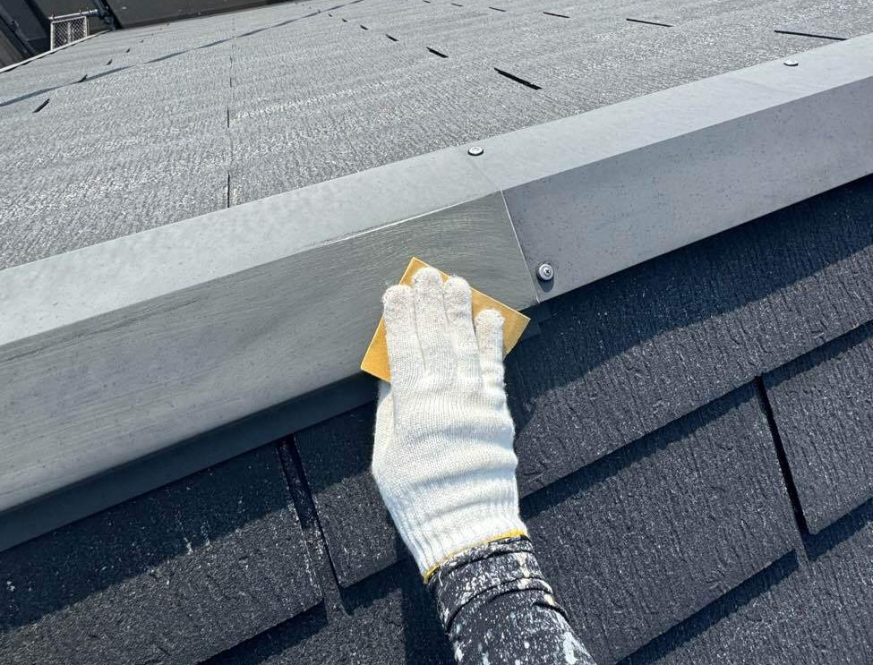 屋根の棟板金のケレン処理を行う写真です |