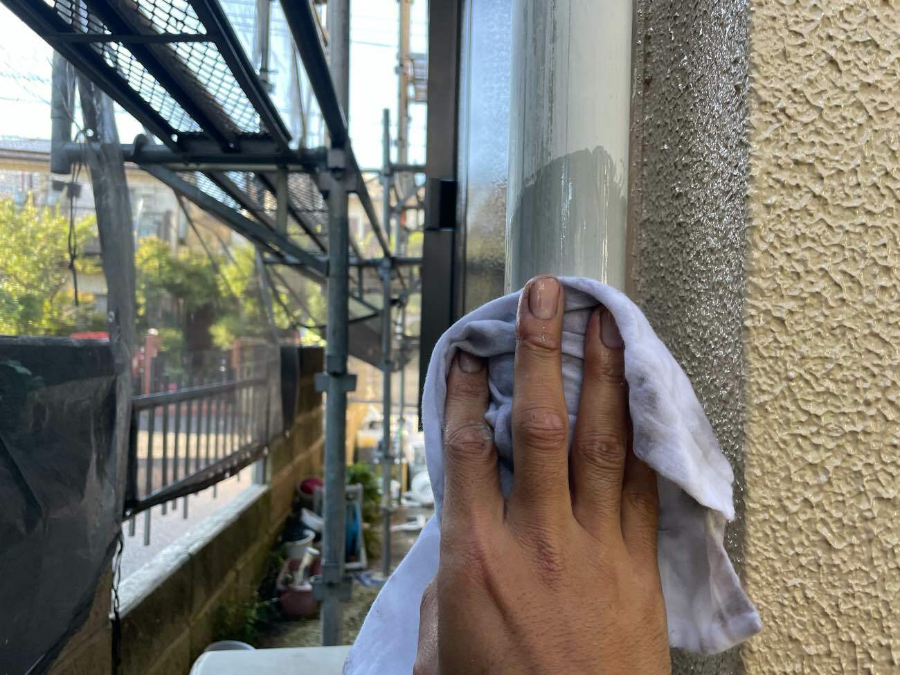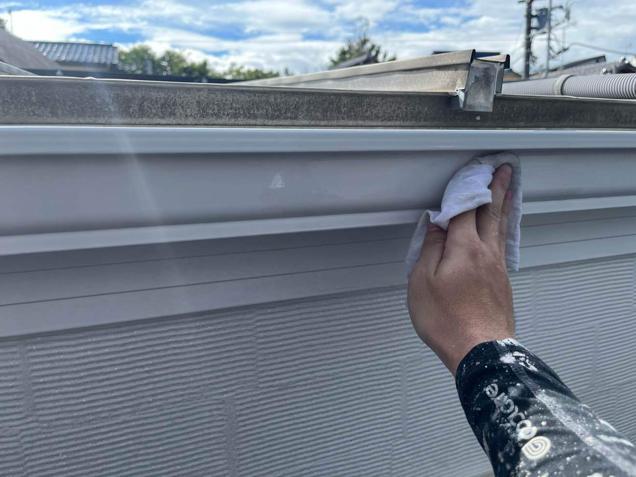 シンナー(溶剤)を用いて雨樋表面を拭き上げることで、通常の水拭きやケレン作業では除去しきれない、微細な油分、シリコン、そして排気ガスによるこびりついた汚れを完全に溶かし、拭き取ります。この「脱脂」を行うことで、塗料が素材に直接触れることができる状態になります。