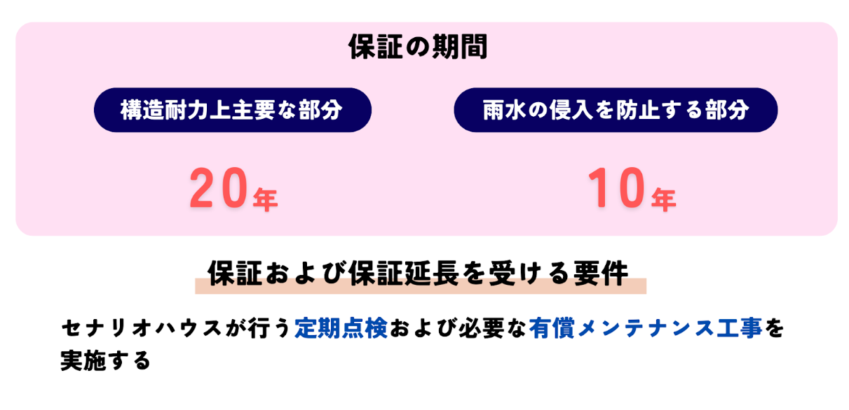 保証を受ける条件として、セナリオハウスが行う定期点検および必要な有償メンテナンス工事を実施する必要があります。定期的な点検と保証、メンテナンスで最長50年の長期間にわたりセナリオハウスが住宅を見守ってくれるという制度設計になっています(参考:セナリオハウス公式|安心保証)。