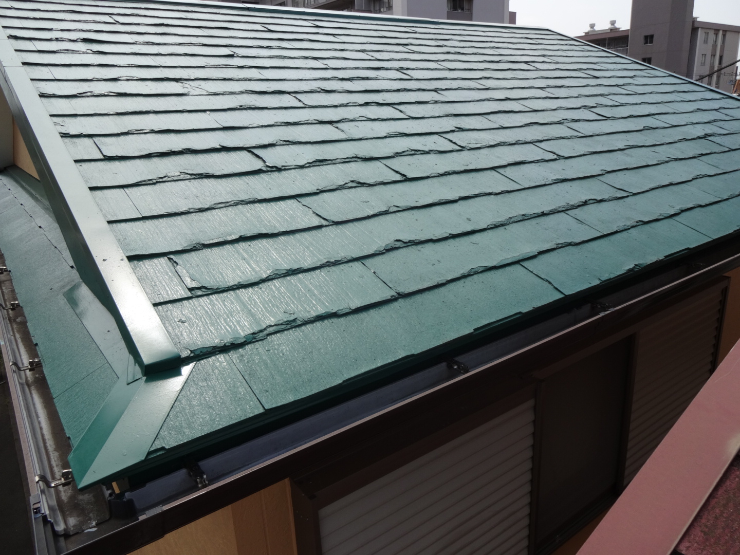 健康面では安全なパミールですが、建材としての耐久性には大きな問題を抱えていました。築10年前後から経年劣化が進むと、屋根材の先端(小口)から層状にパリパリと剥がれ落ちていく不具合が発生するのです。