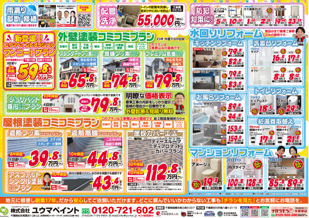 今回より水まわりや内装リフォームも承ります。チラシの裏面に載っていない商品・メーカーも取り扱っておりますので、お気軽にご相談ください!