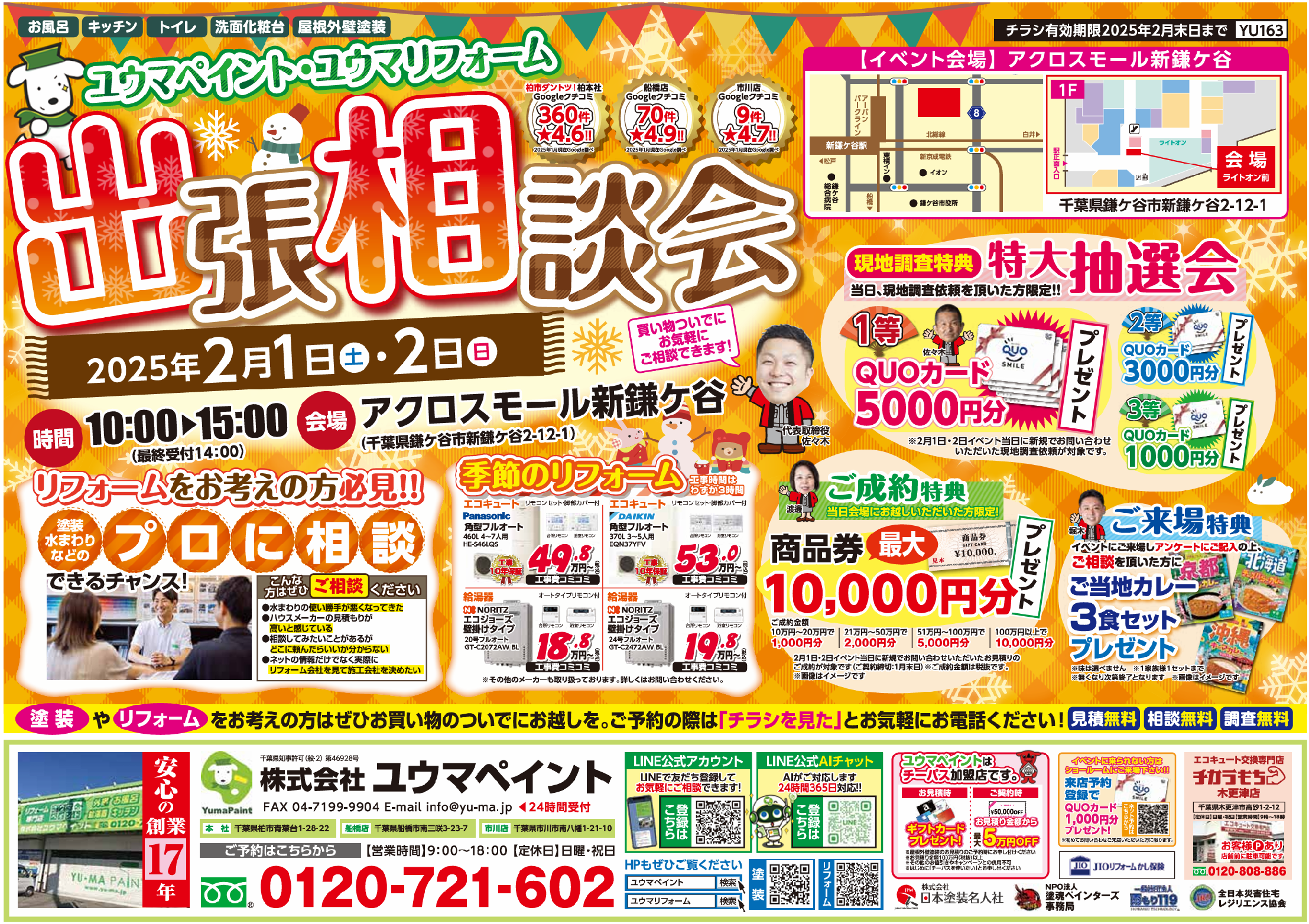 今回の出張イベント(屋根外壁塗装・リフォーム相談会)は、2/1(土)~2/2(日)にアクロスモール新鎌ヶ谷にて開催いたします。