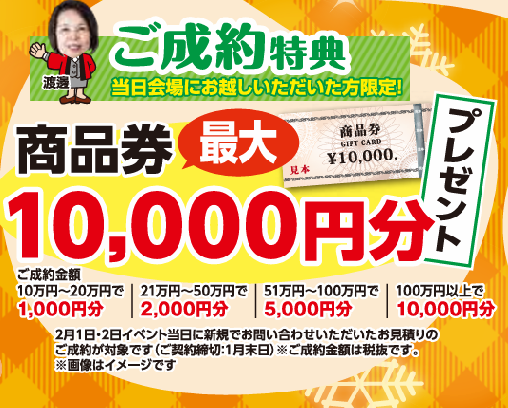 ■2025年2月末までにご契約くださった方に最大10,000円分の商品券をプレゼント!ご契約金額に応じて異なります。