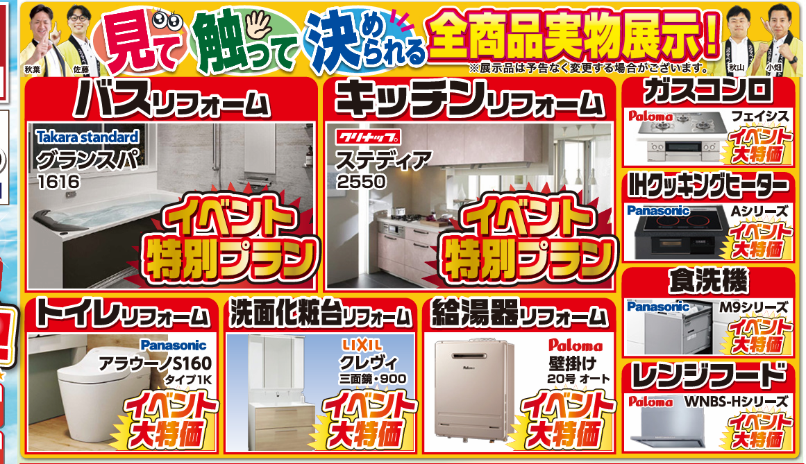 補助金対象となるものもありますので、とてもお得にリフォームができるチャンスですし、現物を見ながらプロとお話ができるので、皆様のリフォームがとてもスムーズに進むこと間違いなしです!