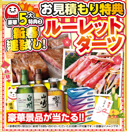 【お見積もり特典】ルーレット&ダーツ お見積もりをご依頼いただいた方は、豪華景品が当たる運試しに挑戦いただけます。カニや高級ウイスキーなど、新年を彩る逸品を手に入れるチャンス!