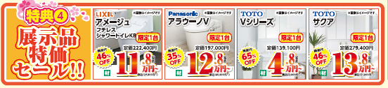 水まわり展示品セール(最大65%OFF): LIXILのアメージュやTOTOの洗面台など、超目玉商品を限定1台ずつで大放出します。